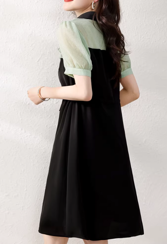 Contrast Lapel Waist Short Sleeve Trendy Skirt 氣質洋裝翻領撞色收腰短袖小黑潮裙